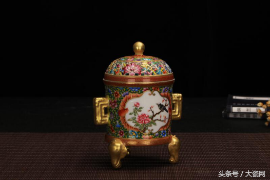 此件作品为仿清乾隆锦地珐琅彩开窗花鸟三足双耳镂空描金香炉,画技高超,花鸟灵动,具文人画风采,似出自御用画家手笔。珐琅彩在乾隆朝进入了极盛阶段,此炉以极精之显微镜窥之,花有露珠,鸟有绒毛,谓之一绝。炉口描金,炉内施湖绿釉,相得益彰,品位卓然。