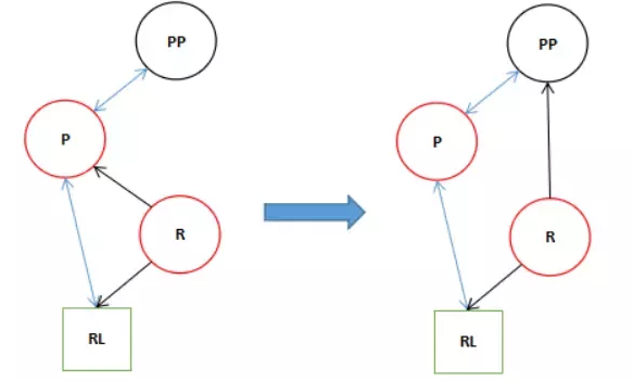 此时如果9行的条件符合的话执行10行RL指向P,如果RL为null的话,P的右节点指向null。