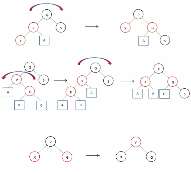 上面的图中描述了红黑树中三种典型的变换,其实前两种变换这正是AVLTree中的两种典型的变换。