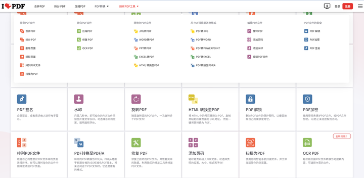 ilovepdf是一个超级好用的PDF在线工具,它简单易用,完全免费,包含了编辑PDF文件、排列PDF文件、优化PDF文件、PDF文件格式转换、PDF文件安全等丰富的PDF处理工具分类。常用到的PDF文件编辑、PDF转word、PDF文件压缩、PDF文件加密解密、PDF拆分合并、PDF添加页码、PDF添加水印、OCR-PDF等,全部都支持批量处理、无需注册登录,完全免费使用。