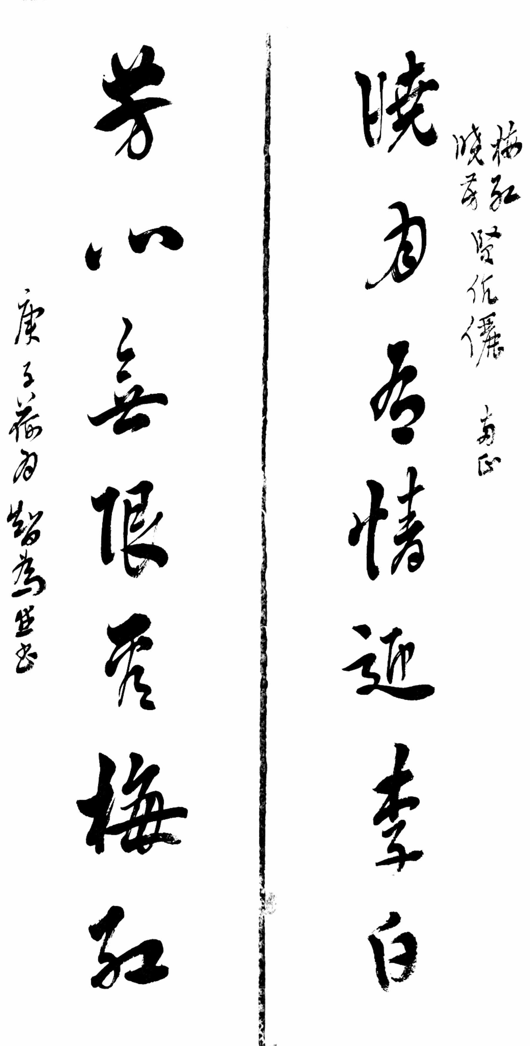 胜天追求“书从诗出”,首先是重视书写的文辞内容与书风之间的内在联系。书法不能脱离文辞而独立存在,即使只写一个字,那一个字也必有它的意义,书法是文辞以至诗文的“载体”。唐代孙过庭《书谱》说:“写《乐毅》则情多怫郁,书《画赞》则意涉瑰奇,《黄庭经》则怡怿虚无,《太师箴》又纵横争折。暨乎兰亭兴集,思逸神超;私门诫誓,情拘志惨。所谓涉乐方笑,言哀已叹。”王羲之的这些帖上是否果然分别表现着这些种情绪,其中有无孙氏的主观想象,今已无从在千翻百刻的死帖中得到印证,但字迹与书写时的情绪会有关系,则是合乎情理的。这是讲作者的撰文情绪对书写风格有所影响。在胜天看来,风花雪月能激发人的创作热情,当诗词、联对随心而发的时候,内心自然涌动起用书法表现出来的欲望,并考虑诗文与字迹风格适宜与否的问题。就像用颜真卿肥厚的笔法、圆满的结字来写李商隐的“昨夜星辰昨夜风”之类的无题诗,或用褚遂良柔媚的笔法、俊俏的结字来写“杀气冲霄,儿郎虎豹”之类的花脸戏词是否得当。