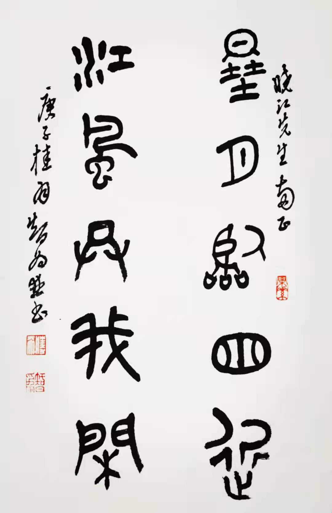 也是未及弱冠,与开始师从石林先生同时期,胜天还拜原丹阳正则艺专教务长、海陵篆刻家叶大根先生为师,学习篆刻,颇有所获。胜天治印,章法得当,疏密展缩因地制宜、合理有度;刀法娴熟,冲切单复相辅并行、因石而定。他擅制朱文巨印,其印风清刚朴茂,线条流畅圆浑,毫无呆板之意。当其步入而立之年,已先后在泰州、姜堰等地举办个人金石篆刻展,曾有人以诗记录当时实况,“方寸之间天地大,一时轰动海陵城。”尔后,胜天的篆刻作品多次参加国家及省内外书法大展,都得到较高的评价。