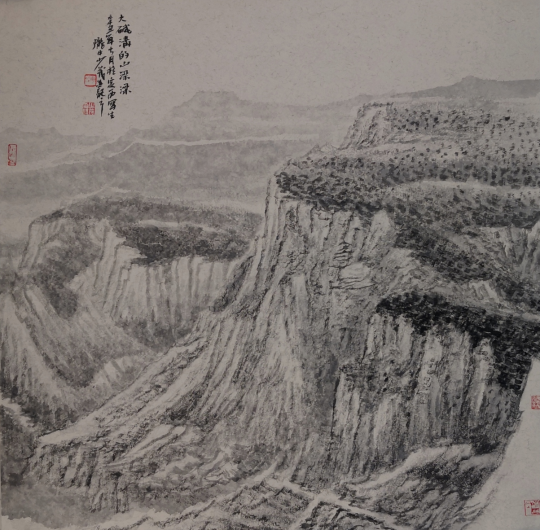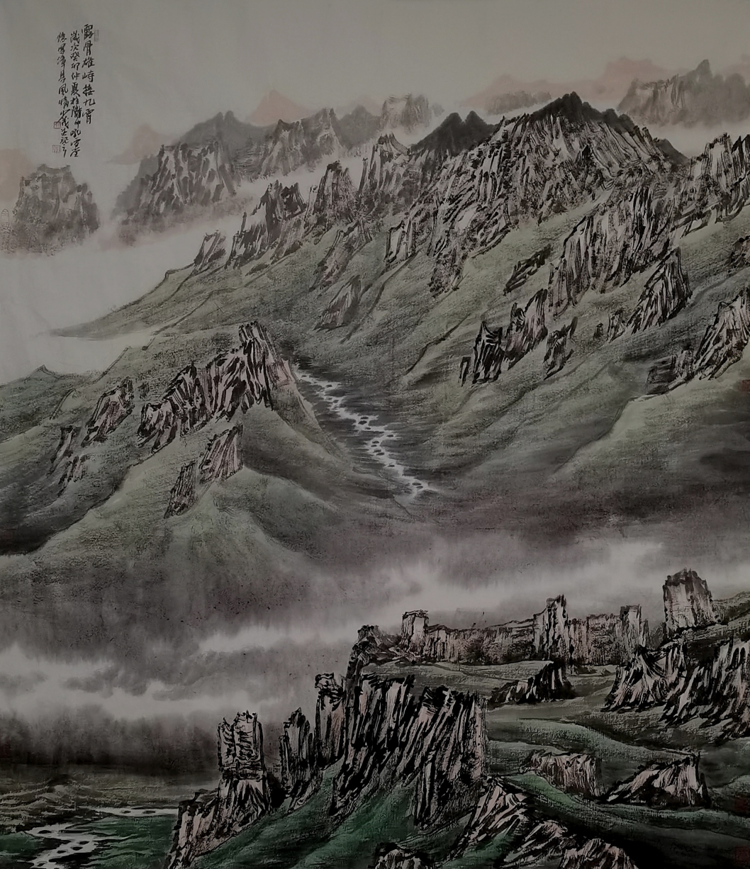 开启西部山水画的三重境界在本土山水画家中,郭文涛和陈天铀的形式风格,或豪迈或沉雄,复活了回荡在西部自然中的金戈铁马之声,这种类似边塞诗风的精神气概,既与西部自然的结构形态和宏大气势相颉颃,也应和了改革开放、高歌猛进的时代氛围,具有强悍的视觉冲击力,为世人所认可和熟知。创作之初,包少茂受其影响和吸引是必然的,所以才有机缘拜陈天铀为师。