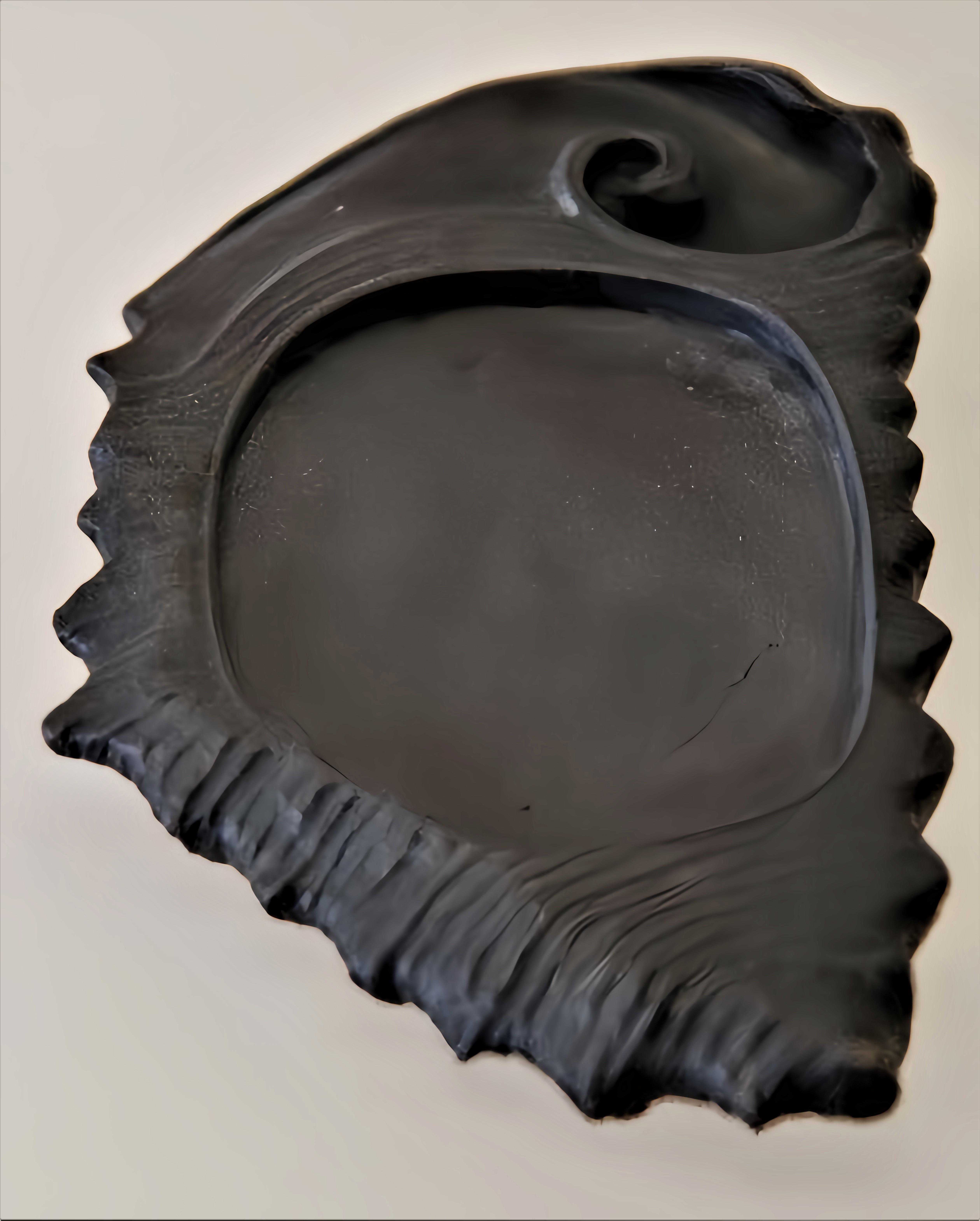 老坑石。砚形如螺蚌,螺身的砚堂可磨墨,螺口的涡形池可用作舔笔。