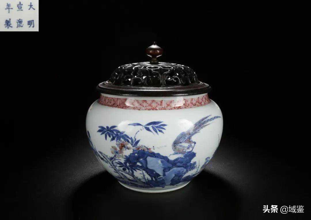 清代对釉里红、青花釉里红不做过细区分,唐英《陶成纪事碑记》有“釉里红器皿,有通用红釉绘画者,有青叶红花者”的记载。对照史料和实物,唐英折中所言马挂瓶实为青花釉里红马挂瓶。这件青花釉里红锦鸡纹罐底款便是“大明宣德年间”的寄托款。