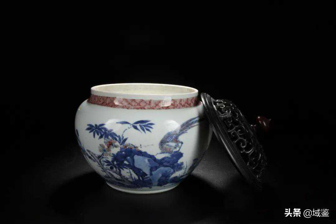 此件清康熙青花釉里红锦鸡纹罐,带盖,直口,短颈,腹身鼓圆,底部承圈足。釉质莹润,远观如白玉一般洁白无瑕,器身颈部缀釉里红回字纹,饰青花釉里红锦鸡纹。青花发色淑丽清雅,勾勒出山石的形状,锦鸡收羽独立,淡淡红晕浸染着绒绒羽毛。山石旁有梅竹相倚,梅枝秀丽,朵朵泛红,竹枝瘦骨,平生出风貌清秀的竹叶而来。以虚写实的效果,表现出一种虚实相生、朦胧幽雅色彩斑澜。其内涵表现得淋漓尽致。
