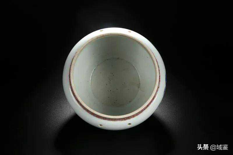 青花的素净雅致与釉里红的深沉艳丽和谐地统一在画面上,正是这种极为难得的工艺,才将这件青花小罐的丰富内涵淋漓尽致地表现了出来。