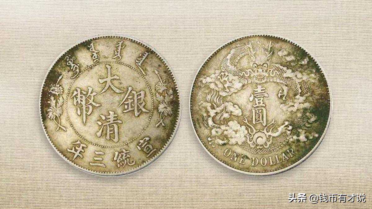 宣三的正面中心部分写有大清银币,上面是满文大清的字样,下面写着宣统三年。背后这面,中间写的是竖排版壹圆的字样,整条龙盘旋而下,腾云驾雾,气势磅礴。
