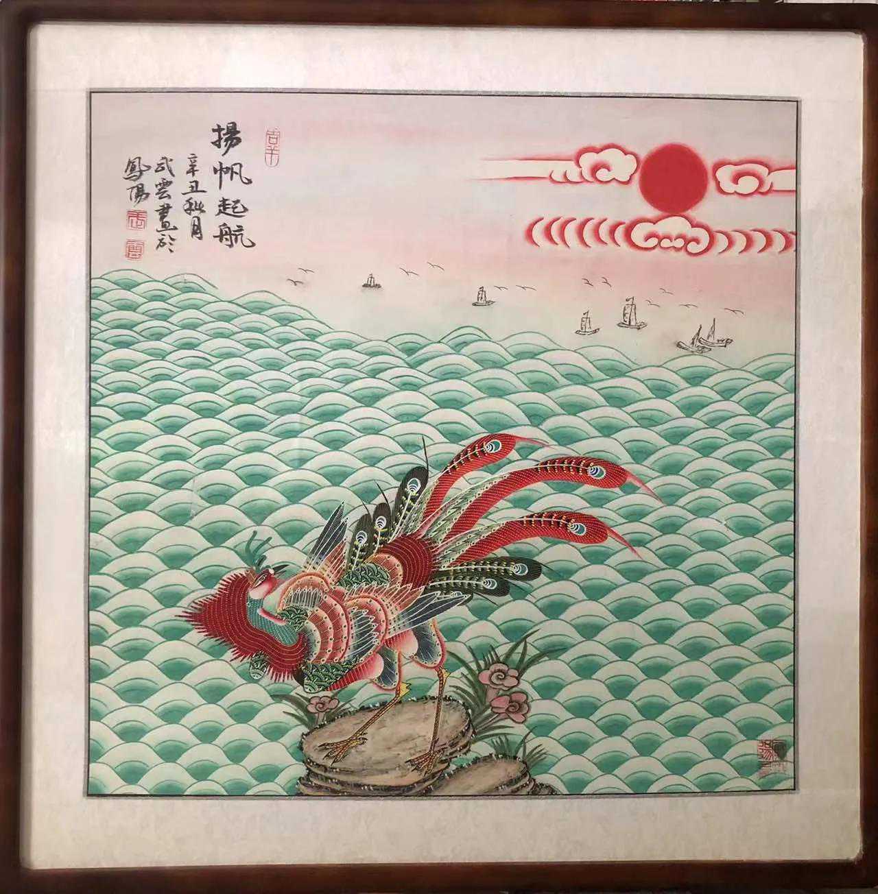 【人物名片】武云,男,安徽凤阳人,现为中国民间文艺家协会会员;世界华人书画家协会皖北分会副主席;安徽省美术家协会会员;安徽省民间文艺家协会会员;上海海天书画院院士;滁州市美术家协会会员;滁州市海外联谊会会员;凤阳凤画研究会副会长,非物质文化遗产“凤阳凤画”代表性传承人。部分作品曾多次参加国、省、地等各级展出或被一些单位和个人收藏。凤画是安徽凤阳独有的绘画艺术,它起源于元末明初,距今已有600多年历史。凤画以其悠久的历史和独特的风格及旺盛的生命力,已成功列入安徽省第一批非物质文化遗产,被称为安徽民间艺术“三绝”之一,与灵璧的钟馗画、天长的判官画齐名,蜚声海内外。在众多的凤画艺人中,武云老师是有代表性的一位,算得上是凤画传人之一。武老师告诉笔者,相传朱元璋当上皇帝后,在家乡凤阳建造一座皇城——中都城。忽一日从天边飞来一只五彩凤凰,金光闪闪,祥云缭绕,香风习习。那凤凰鸣叫数声,在皇城上空翱翔一圈,遂飞到城南一座小山上落下,这小山正是朱元璋父母的墓丘(今为明皇陵)。全城百姓扶老携幼争相观看。正巧,人群中有一位画师将凤凰模样画了下来。自此,他就以画凤为业,开设画店,传经授艺,并在每年春节绘制几幅精品献给朱元璋。皇后马娘娘尤为喜爱,总是挂在后宫大殿上,率领众嫔妃焚香朝拜,祈祷富贵吉祥。作为语文教师,武云有着较深厚的文化功底,对于家乡特有的凤画艺术,自然有着不一般的见解。他认为,相对于传统国画,凤画用色浓墨重彩,让有些人觉得艳俗。然而,这实在是审美误区。凤画色彩如同北京故宫、颐和园等处的明清建筑,雕梁画栋,大红大绿,处处彰显皇家的尊贵、霸气和历史的凝重。笔者对此深有同感,红绿相衬,工笔重彩,色调明丽,正是凤画的独特之处。武老师告诉笔者,凤画是以画凤凰为主,以画翎毛、花卉为辅的工笔画。在绘制技法上,吸取了工笔花鸟画的勾线敷色技法,又兼蓄年画通俗画风,有“五彩、素彩、水墨”的色彩表现手法,能做到雅俗共赏。长期以来,凤画在历代艺人们不断努力下,其构图造型设计等方面都有固定的规格和程式。造型必须为:“蛇头,龟背,九尾十八翅;鹰嘴,鹤腿,鸡爪,如意冠。”这已成为凤画艺人画凤的口诀。如有偏离或某处不到位,都不够格称为正宗凤阳凤画。凤画的题材有很多,如丹凤朝阳、百鸟朝凤、带子上朝、五凤楼、龙凤图、凤撵麒麟、百鸟献寿、四扇屏等,其绘画工序有九项:画骨、披毛、勾线、头道墨、二道墨、三道墨、描粉、涂黄和点金,表现手法有三种:一是墨凤,二是素凤,三是彩凤。武云老师对于凤画创作的热情,不仅是出于喜爱,而且是一种责任。他认为,自己身为凤阳人,对于凤画不能作为旁观者,而应该为凤画这一独特艺术添墨加彩。在这种信念驱使下,武老师在完成正常教学任务的前提下,把大量的业余时间用在了凤画创作上。为提升自己的艺术内涵,他还拜著名书法家谢一俊为师,使研习书法与凤画创作相得益彰。凤凰不落无宝之地。凤阳,这座皖东历史名城,因改革开放而出名。如今,在武云等一大批艺人的辛勤努力下,辉煌发展的凤画,必将使凤阳古城更加声名远播。
