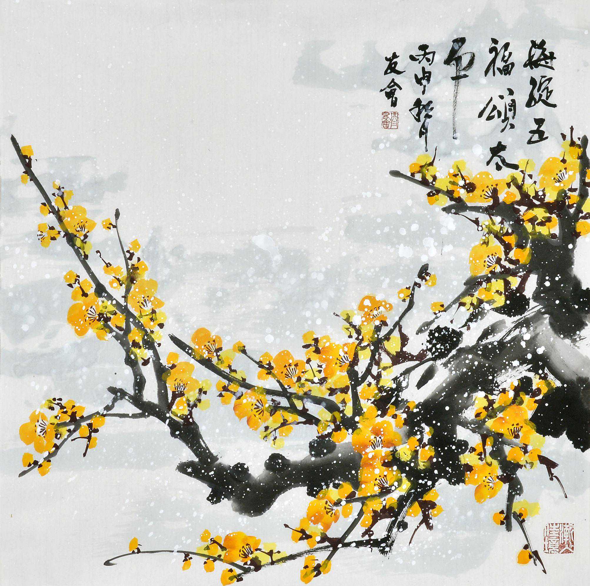闫友会,字昆石,号馨香堂,山东高唐人,现居北京。幼年受苦禅大师故乡浓厚的文化氛围影响,酷爱书画艺术,几十年笔耕不辍,尤爱画梅。潜心研究岭南画派大家关山月,以及名家王成喜的画梅技艺,博采众长,终得心愿。所画梅花繁花累累,缤纷烂漫,花朵丰腴饱满,明亮夺目,满树炽烈如火,通幅激情四射。画中梅花枝干虬曲,老干疏枝,老辣浑厚,而又不失典雅俏丽。疏影横斜之神态勾勒得淋漓尽致,可谓独树一帜。其鸿篇巨制的树梅,或尺幅小品的折枝、或春梅、或雪梅、月下之梅、冰崖之梅独辟蹊径。师法自然,着浓艳于浑厚,涵茂密于清逸,逐渐形成了自己独特的画梅艺术风格。