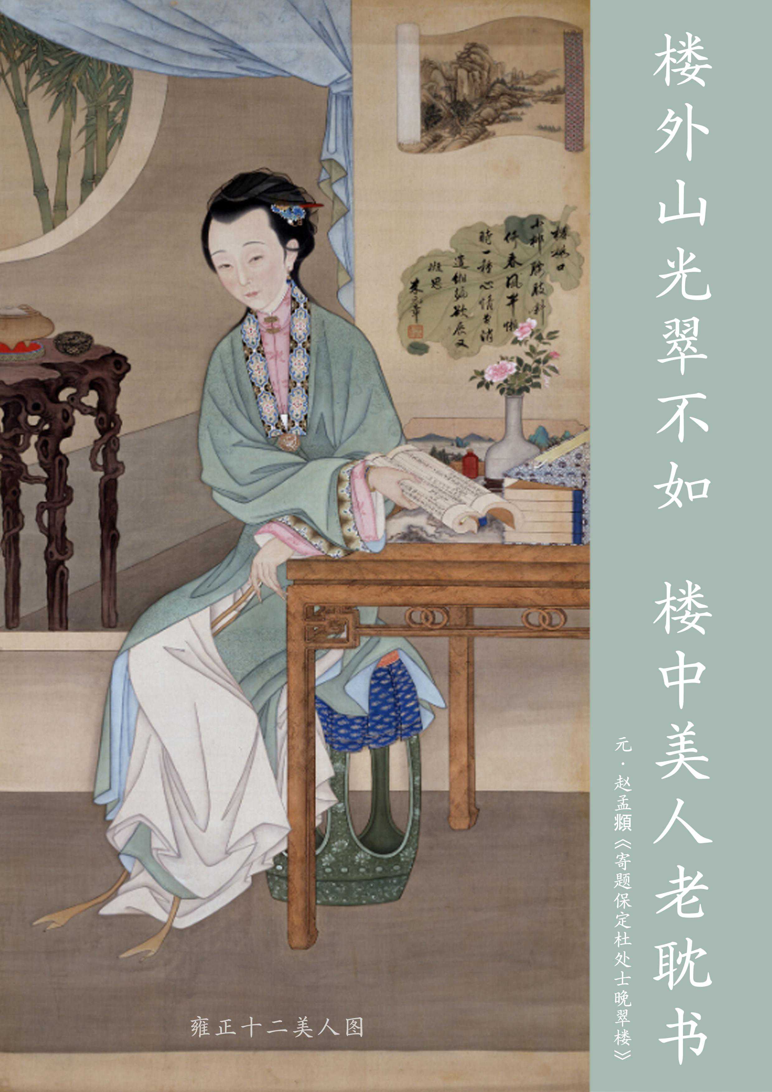 这幅《雍正十二美人图》中,“抚书低吟”的美人,衣服即为醽醁色,非常淡雅。