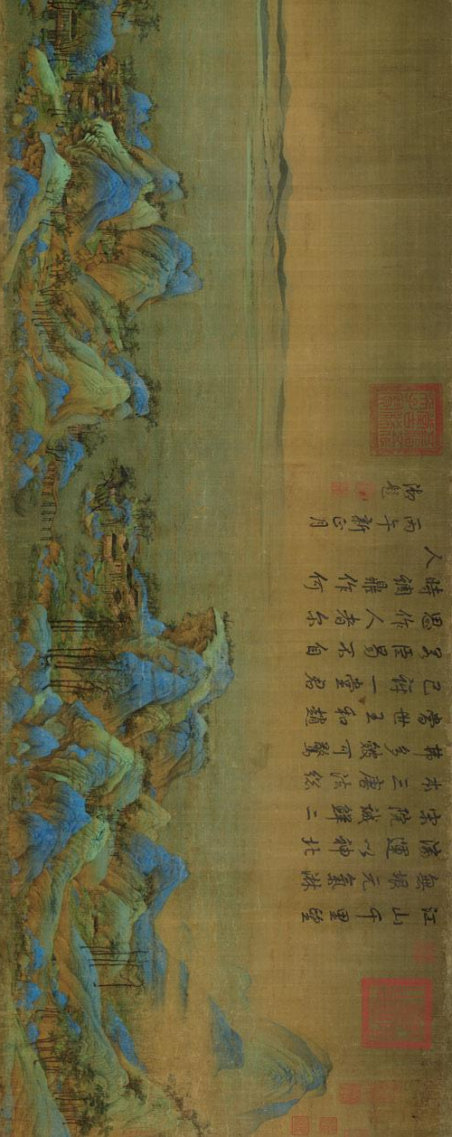 《千里江山图》局部,北宋,王希孟作,现存于北京故宫博物院。《千里江山图》卷在设色和用笔上继承了传统的“青绿法”,即以石青、石绿等矿物质为主要颜料,敷色夸张,具有一定的装饰性,被称为“青绿山水”。中国传统绘画中的石绿,就是用孔雀石的矿石研磨而成的。孔雀石的主要成份是盐基性碳酸铜,和蓝色的矿物性颜料“群青”同属于铜的化合物。