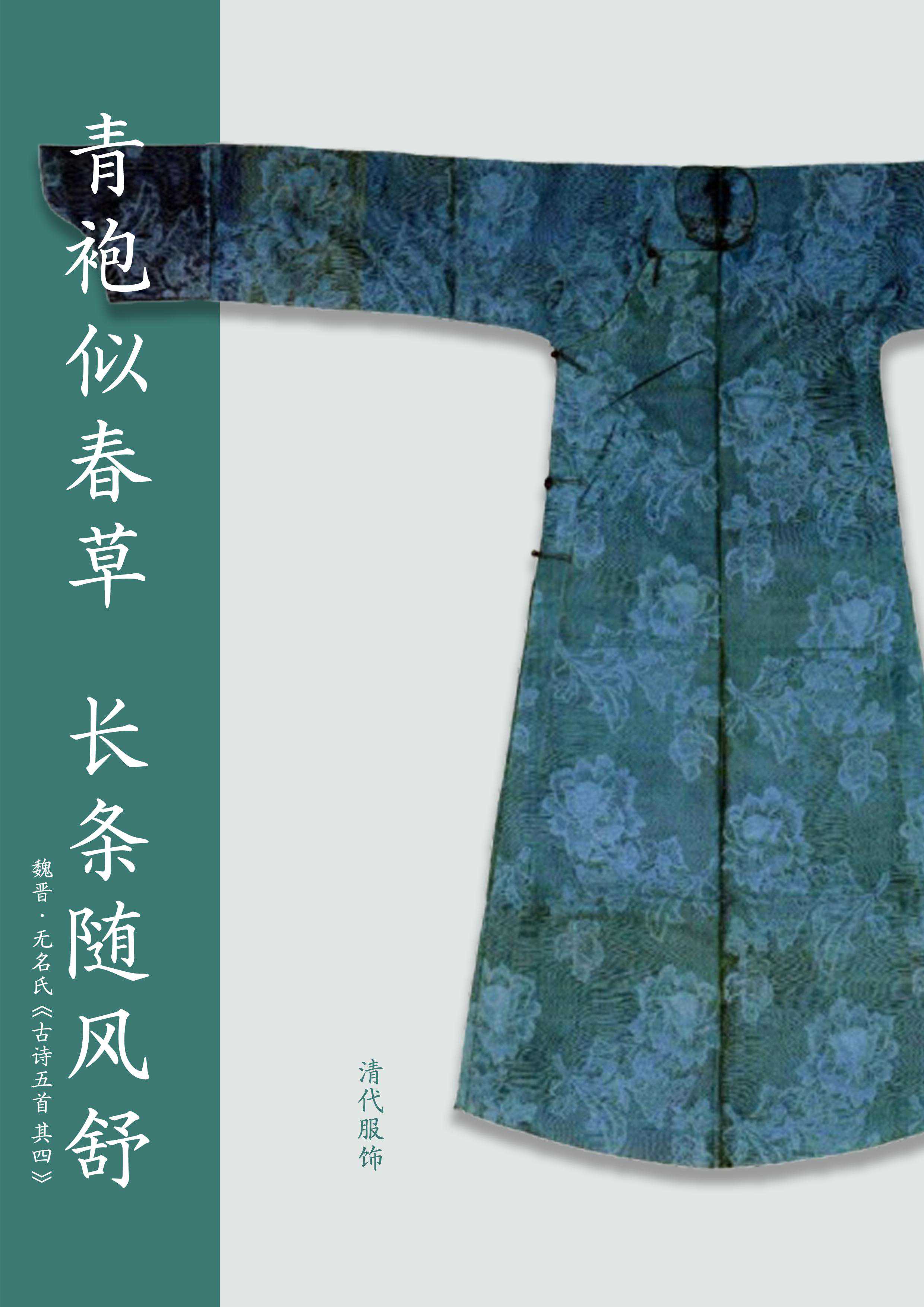 配色灵感:青地黄花氅衣,不同明度的青色交相融合,柔情摇曳、落落大方。