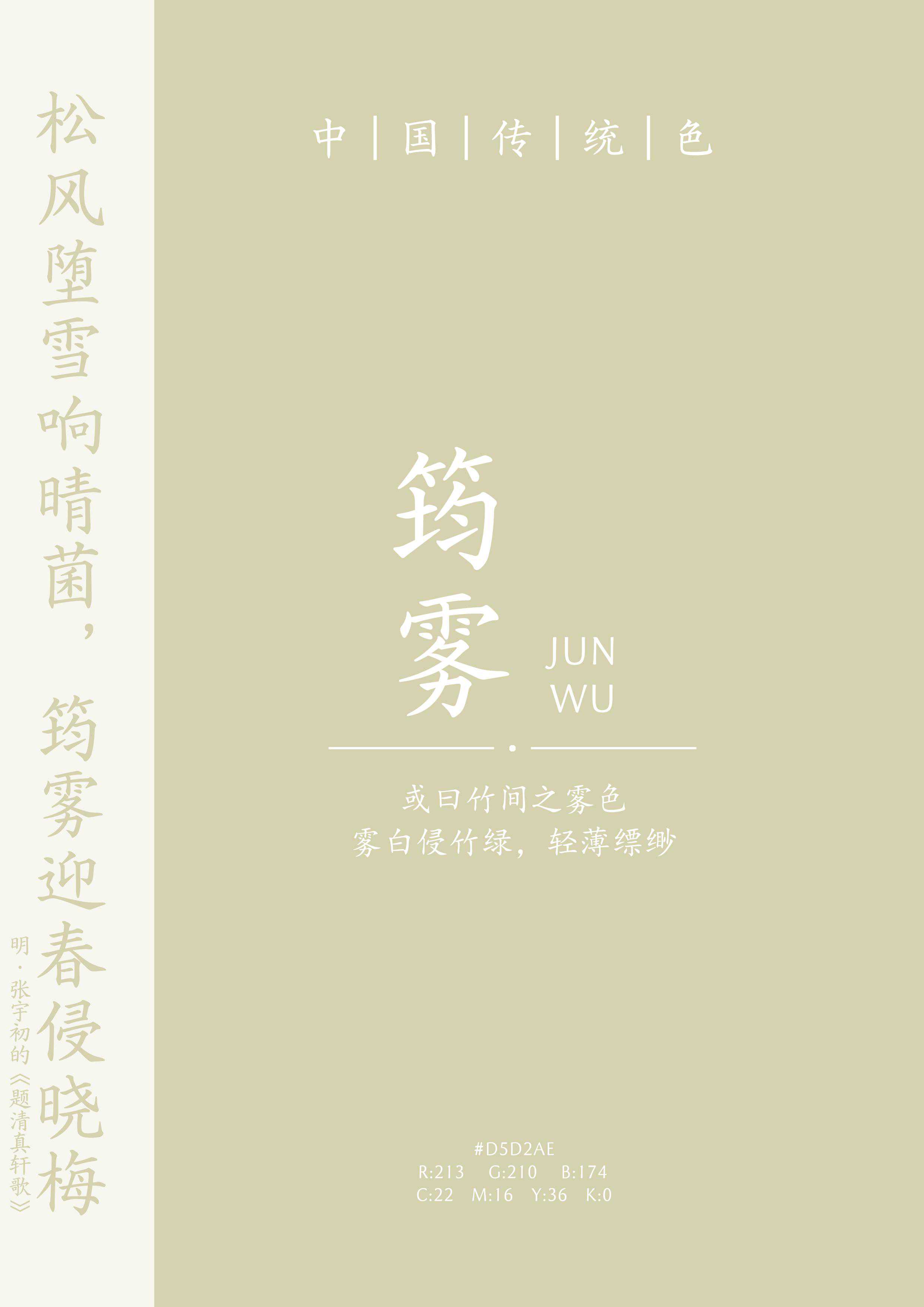 “松风堕雪响晴菌,筠雾迎春侵晓梅。”(明·张宇初的《题清真轩歌》)筠(yún),即竹皮,借指竹子。筠雾,竹皮的颜色,轻薄如雾,故为此名。“裁筠比雾,裂素轻蝉”。或曰竹间之雾色,雾白侵竹绿,轻薄缥缈,浑然一体,仙气十足。