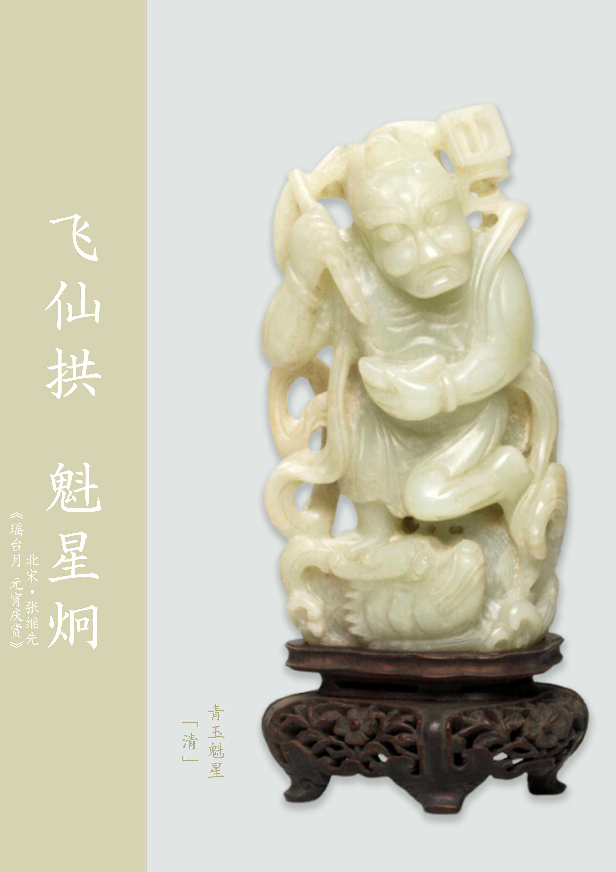 这件青玉圆雕魁星也是仙气飘飘。他一足后翘,一足站立于水中鳌鱼头顶,右手握笔,左手持银锭,周身飘带上还雕饰一量斗。形象生动,又包含了魁星点斗、独占鳌头的美好寓意。