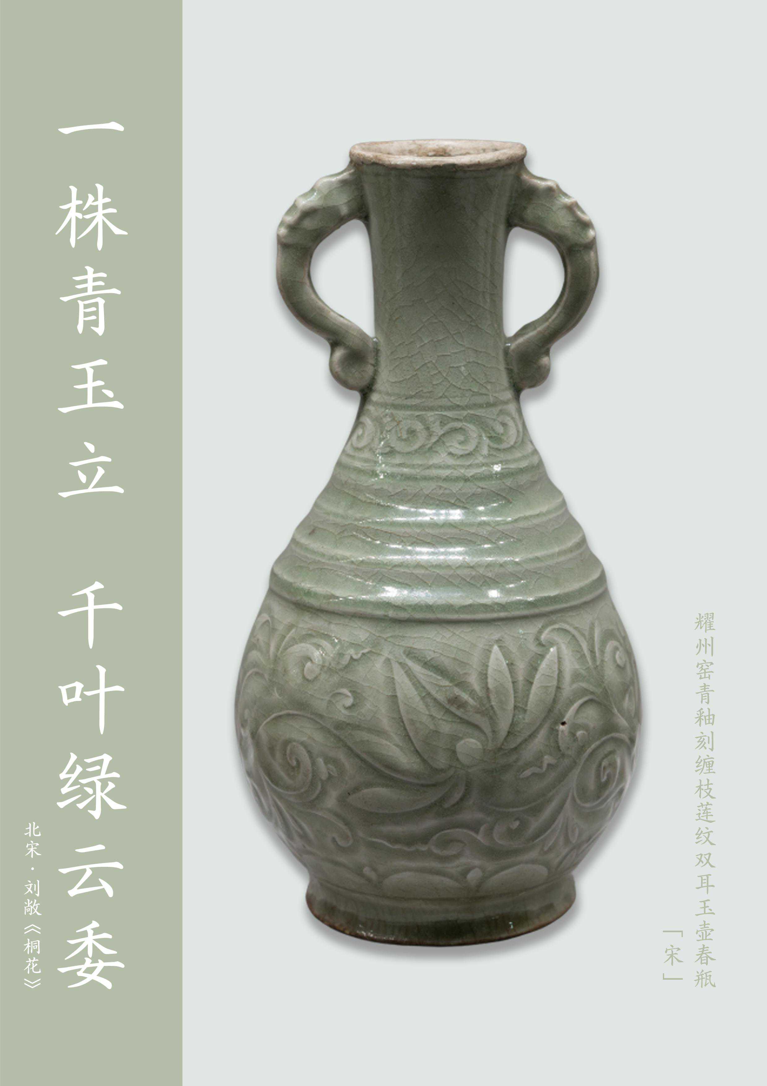 这件耀州窑青釉刻缠枝莲纹双耳玉壶春瓶,瓶撇口,细颈,鼓腹,圈足。颈两侧对称置龙耳,腹上部凸起弦纹4道,下部阴刻两朵莲花图案。通体施青釉,外底无釉,灰白胎。此造型的瓶式俗称“玉壶春瓶”。纹饰立体感强,花叶阴阳向背分明,刀锋犀利,线条流畅,别具风格。