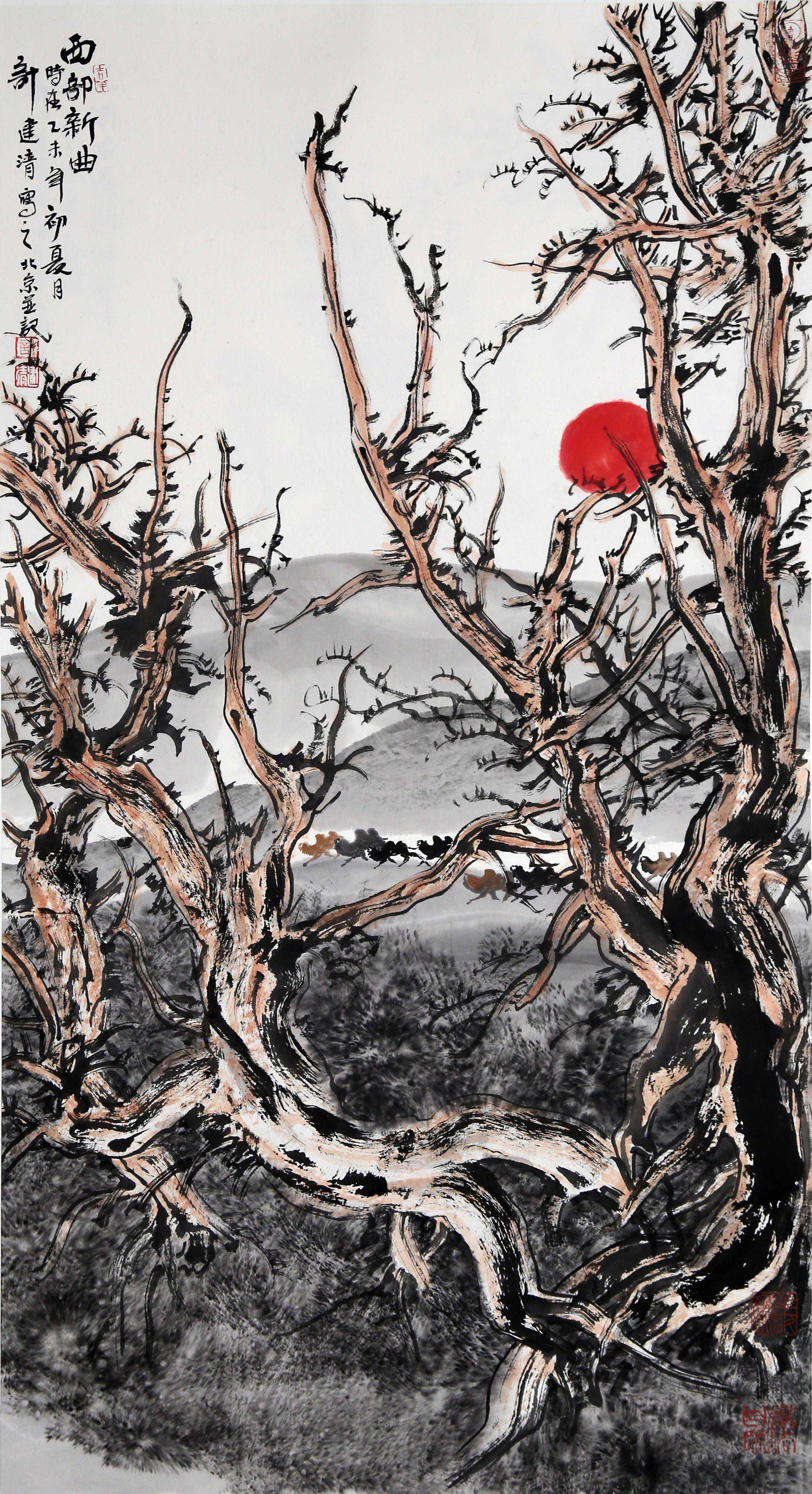 计建清创作的《关山雄风》,《古道奇观》《西部牧歌》作品中,浑厚华滋风格的手段主要是他特殊的笔墨追求。在他的笔下,墨成了自然的性灵,成了万物之光彩,“一墨大千”——千变万化的山川景色在他的笔下通过墨色充分表现了出来,且有许多出人意外的墨色韵味在画面上呈现。他作画常以浓墨、淡墨、焦墨、宿墨、积墨、泼墨、破墨法,有时数法并用,有时洗砚水、洗色碟水也统统用到画上去,用笔方法的变化极尽能事,这样便于笔墨的自然之中有些特别的机趣。