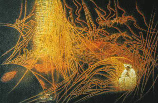 第二代是出生于20世纪50-70年代、成长于20世纪80-90年代的画家,如朱训德、陈明大、陈巽如、莫高翔、海天、王炳炎、王志坚、漆跃辉、谭智勇、吴荣光、石纲等,又如周玲子、丁虹、姜贻华等。朱训德的《洞庭吟》中,金色的线条编织点亮了夜空,照映出停泊在湖心的船只、蹲坐在船只的渔民以及湖面反射的月光,静谧中律动横生,温暖里尽显恢宏。陈明大的《时空》系列,描绘了都市人物与古老遗迹共处同一时空的画面,具有浓厚时代气息。
