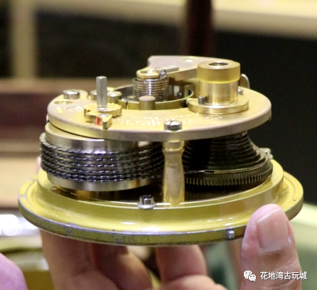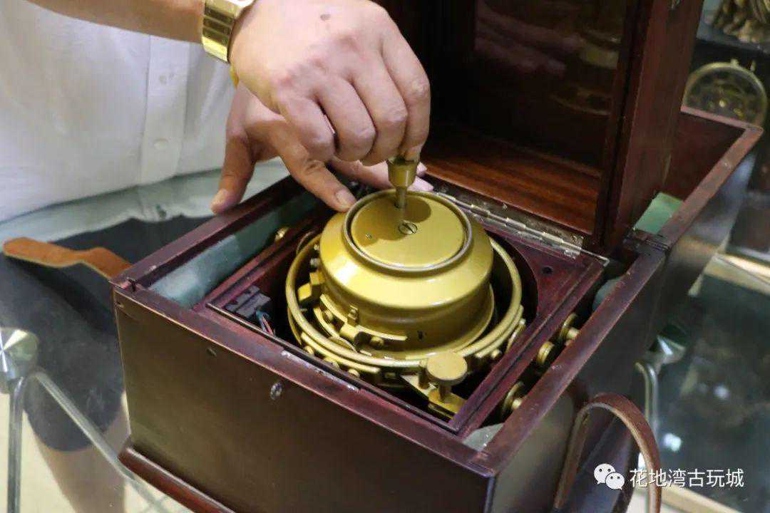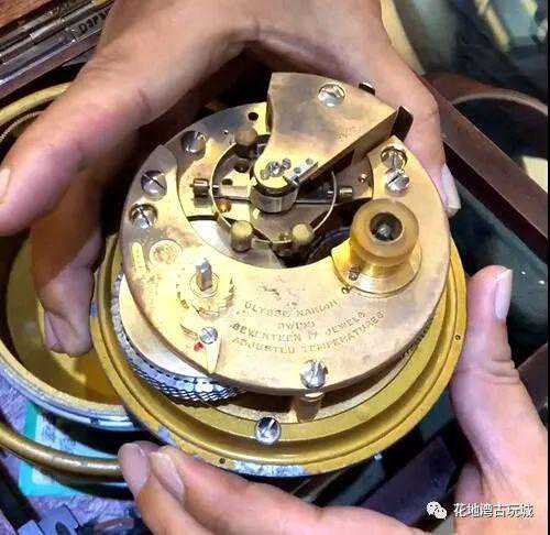 这台编号为8828的雅典船钟,固定在一个约20厘米见方的木匣里,机芯装在铜质的外壳内,外壳安装在常平架上,船舶颠簸时可保持机芯处于水平姿态,从而消除产生位置误差的条件。
