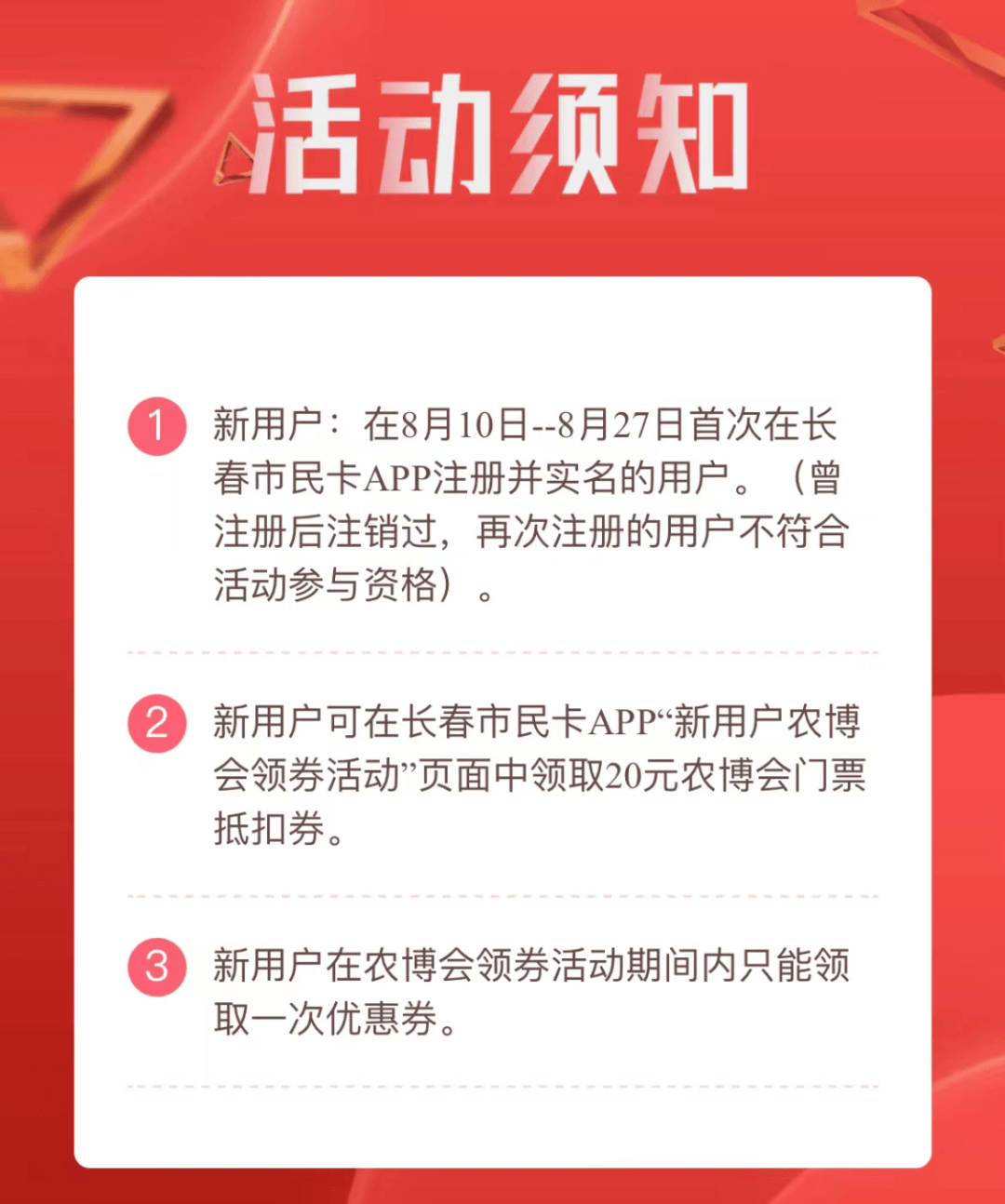本次活动通过长春市民卡APP获得的农博会门票,用户可至长春农博园出示长春市民卡APP中门票二维码入园。门票有效期至农博会结束。