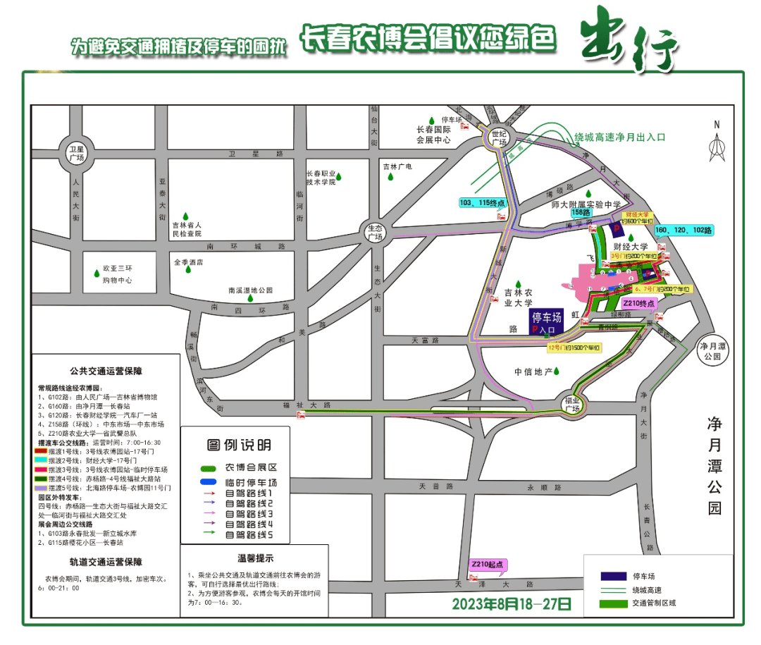 5、G120路:由长春财经学院—汽车厂一站双向发车,在净月大街农博园站下车,再乘坐公交摆渡1号线到达农博园展馆区1号门、17号门周边;也可选择乘坐公交摆渡3号线到达农博园展馆区7号门、室外展场区11号门、12号门周边。