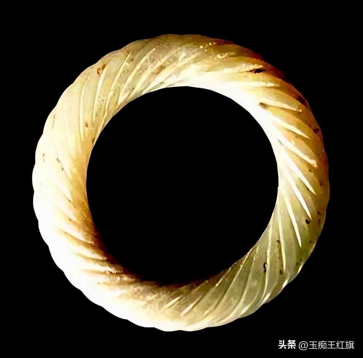 镯外围呈半圆,雕琢绳纹,上下边沿处由弦纹隔断,内侧光直无纹。这样的绳纹为半绳纹,并不绞圈。发展到西周时,见有双龙首绳纹体型璜。春秋战国时是绳纹古玉的鼎盛时期,绳纹镯、环时有出土。王侯贵族使用玉质细腻温润、光泽晶莹的青玉较多,白玉极少。此时的绳纹较细密,并360度斜向绞圈,考古学术界将这样的绳纹称为绞丝纹或扭丝纹。