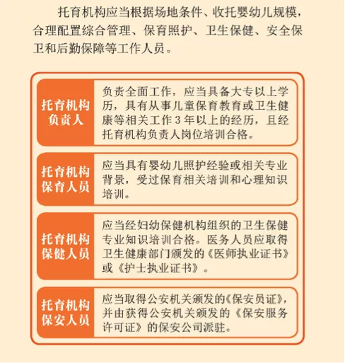 收托50人以下的托育机构,应至少配备1名兼职保健人员;收托50-100人的以上的,应至少配备1名专职保健人员;收托100人以上的,应至少配备1名专职和1名兼职保健人员。有条件的可配备医务人员。