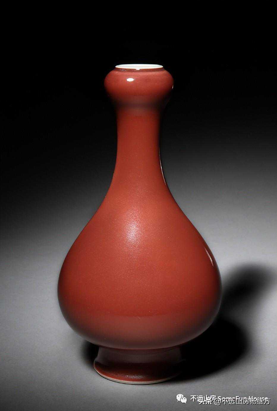 铁红釉,又称矾红、珊瑚红釉,是以氧化铁为呈色剂,在低温氧化气氛中烧成的一种微带橙黄的砖红色釉。雍正时的珊瑚红器釉层薄透而均匀,有明显桔皮纹色调沉着光润精美,呈现出富丽堂皇精致典雅的宫廷气象。珊瑚红釉是康熙时期创烧的低温彩釉,以铁为着色剂,因其釉色红中闪黄,色如红珊瑚而得名。此品颈部细长,器形秀美挺拔,如美人娉婷婀娜,全器满施珊瑚红釉,釉色细腻匀净,鲜艳纯美。《陶雅》谓之“华贵中之佚丽者也..匀净明艳,殆亡伦比。紫晶逊其鲜妍,玫瑰无其娇丽。”胭脂红虽然在康熙中早期就传入景德镇御窑厂,但是由于科技含量较高、造价较昂贵,直到康熙末期也没有被御厂普及使用。雍正中后期,由于御窑厂制瓷的发展革新,胭脂红逐渐推广使用至众多彩瓷领域。