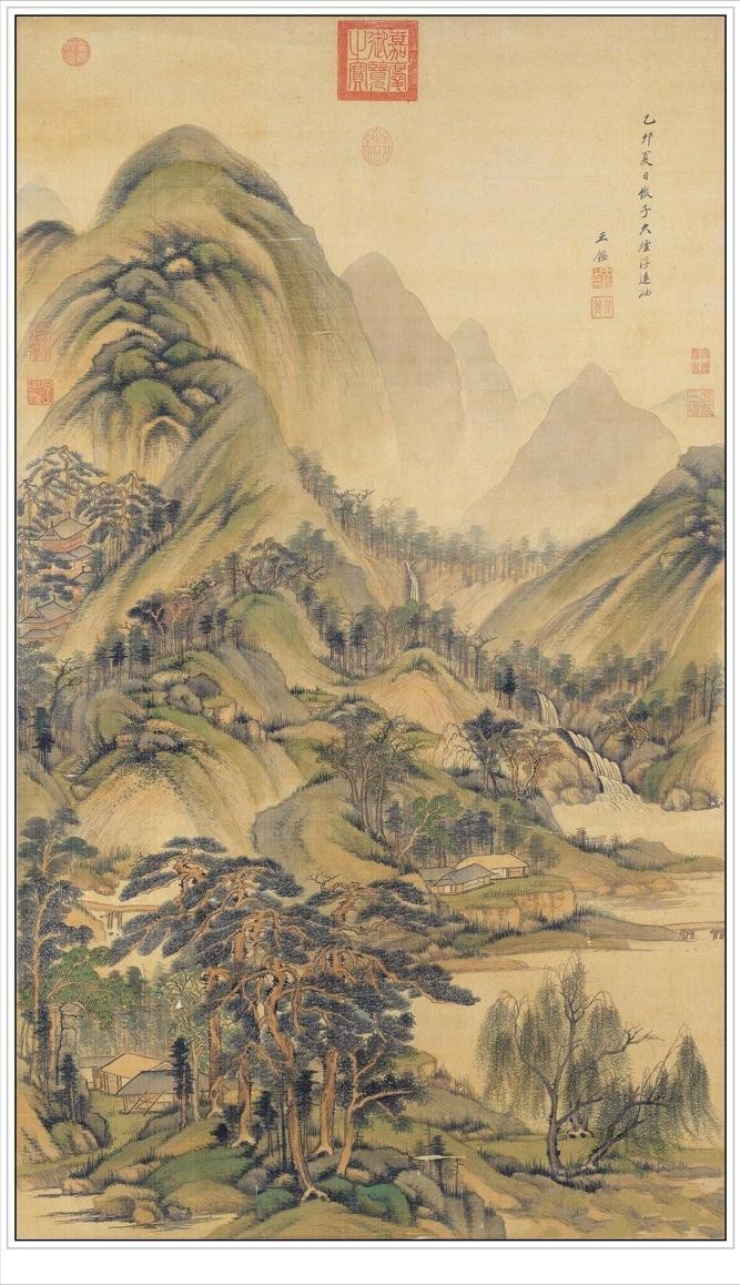 王鉴此图画层层山峦簇拥主峰,苍翠丛林之中,村舍水阁错落,山石用长披麻皴,深得巨然之韵。