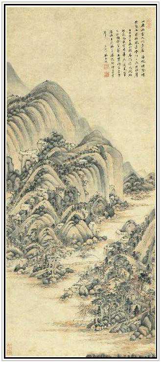 北宋山水画追求的是一种可游可居的景致,用笔用墨都在点滴之间,体现山水为媒的感觉,王鉴模仿元代画家吴镇的这幅《溪山深秀图》也恰到好处地将古人的意境体现得淋漓尽致。在书画收藏大家董其昌收藏吴镇的《溪山深秀图》时,王鉴借来观看了几个月的时间,仿画出了《溪山深秀图》。原来的吴镇的那副《溪山深秀图》就不知下落了。