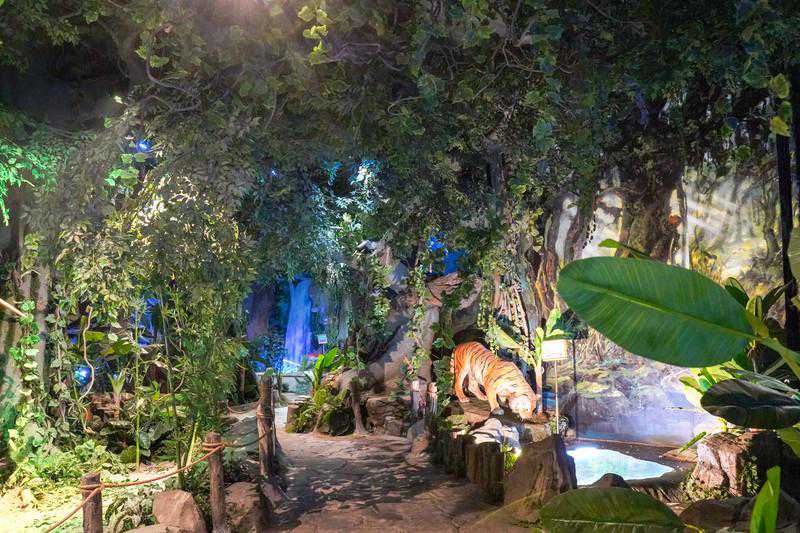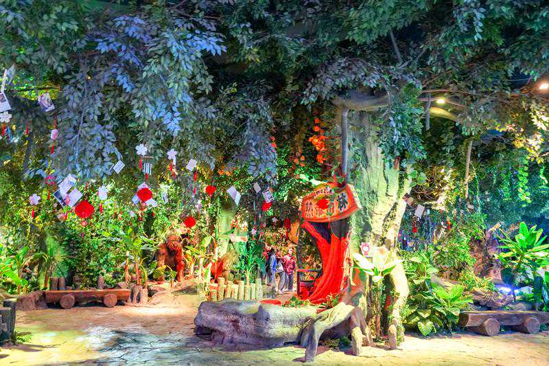 郁郁葱葱的热带雨林和风情独特的南非草原在这里相遇,头顶尖角的犀牛和高大威猛的大象,逼真的模型,精致的细节,仿佛时空速移,大开眼界。地下晶窟、兴波殿里用千奇百怪的钟乳石奇观向游客们展示着鬼斧神工的地下世界,五花八门,甚是神奇。