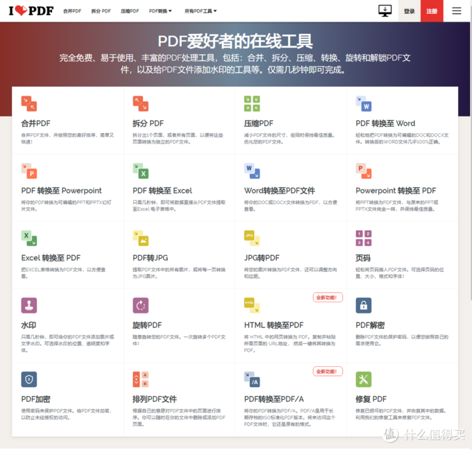 ILovePDF集合了所有和PDF有关的操作,无需注册,即用即走,多说无益,给你们看看页面。