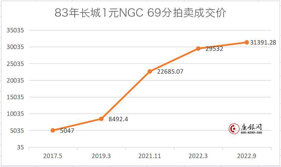 拿83年长城1元举例,NGC69分的拍卖价,可谓是年年创造新记录!