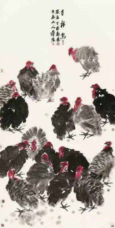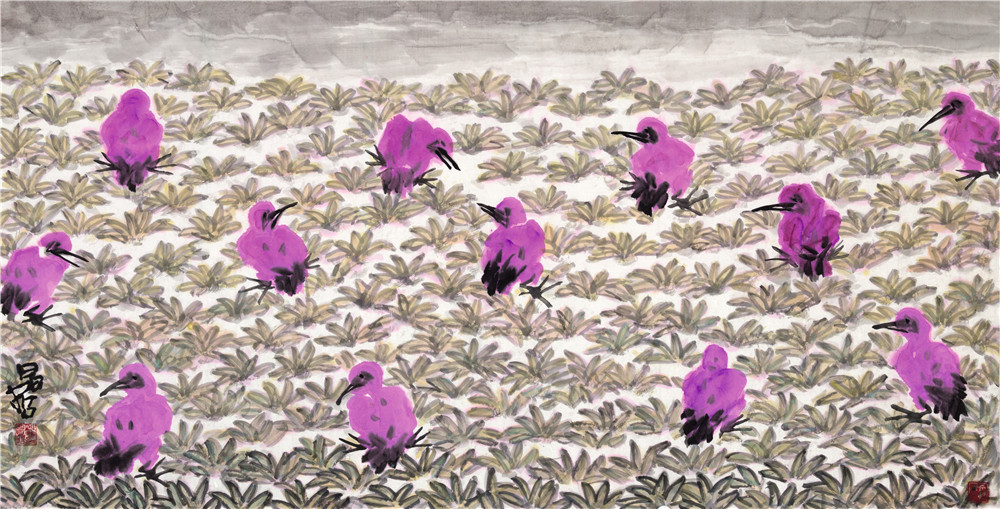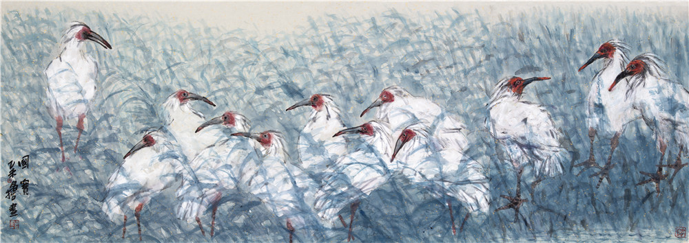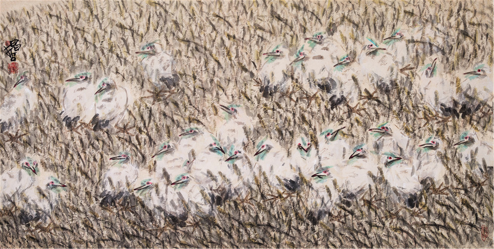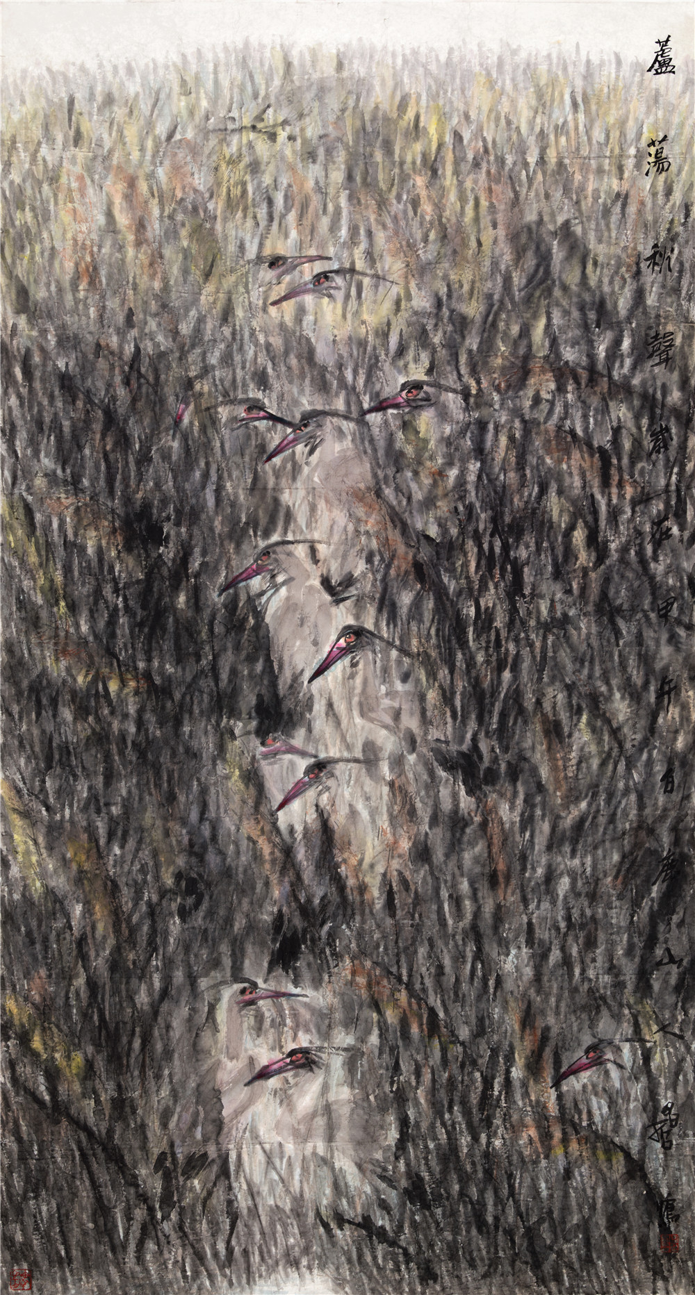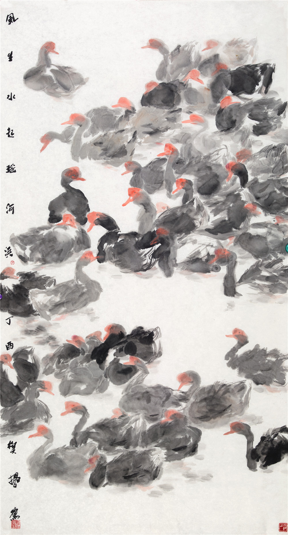 他笔下那些“似与不似之间”的水鸟,或相互依偎,或傲然自立,或肃然列阵,或欢快起舞,弥漫着宁静和谐的生命气息,让人联想到现代人类与大自然共生共存的亲缘意识和环保意识,使作品体现出现代品格。这种“写生”是真正意义上的“写生”,即写生命,写出了花鸟世界的生命,也写出了画家自我的生命。正因为主客体生命结合在一起,因而产生出巨大的艺术震撼力和感染力。