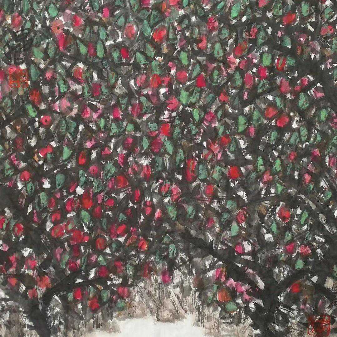 昌哲的用墨着色,对比显明,构成强烈的视觉冲击力,增加了画作的艺术效果。墨与色多是水灵灵的,丰沛的,湿润的。若用到焦墨、朱砂,也更突显出苍茫、奇崛之气。