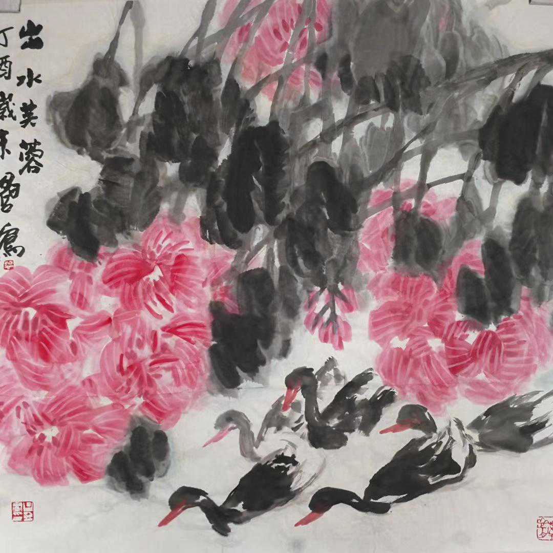 《鹅戏》《月影》中水色和倒影的巧妙处理,《秋色》《秋菊》《芙蓉花》等作品的色调安排,均颇有新意。大写意画的突破,除了攻研文人画传统外,还应打开思路,树立“大传统”观念。比如,先秦美学中有关“大美”的理论,远古艺术的神秘感和运动感,汉代石刻的大洗练与大气势,民间艺术的鲜活、质朴与大巧若拙,乃至西方艺术中的某些技法,都可以成为大写意者的启示和借鉴。困难在于要将它们自然地融入到大写意本体语言体系之中。樊昌哲在这方面所作的探索和追求,很是可贵。