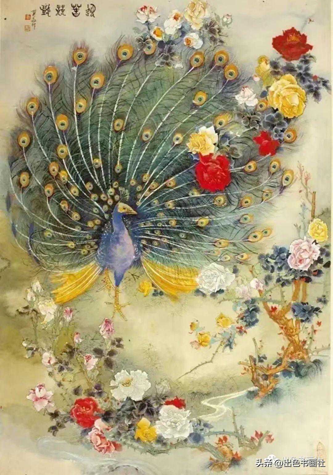 区丽庄笔下的孔雀图艳而不俗,神态生动,格调高雅,生活美与艺术美跃然纸上。