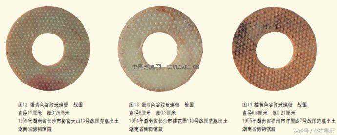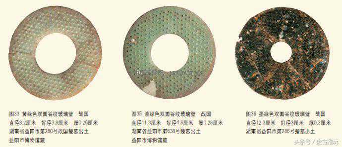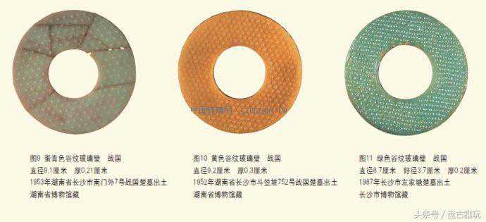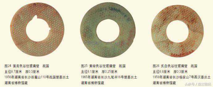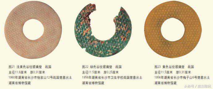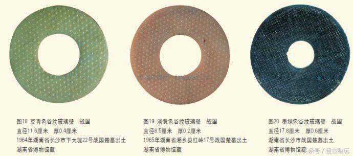 湖南出土的玻璃璧,以谷纹璧出现的时间最早,在战国早期就出现了;流行的时间最长,从玻璃产生之日起,直至消亡之日,前后长达六百多年;数量最多,占玻璃璧总数的十分之九以上。