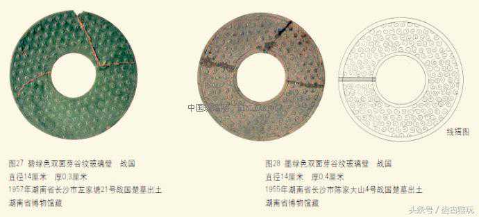 芽谷璧所谓芽谷璧,就是谷粒上刻有幼芽,乃五谷初生之象,非常形象。在以农业为主的古代中国,这种纹饰寓意五谷丰登,是祥瑞之象。现在学术界,对这类芽谷璧,有称谷纹、云纹、满纹、卷云纹、卧蚕纹的。其纹饰优美,做工精良,内缘外缘均有弦纹,是玻璃璧中最精致的一种。目前发现的芽谷璧以绿色者最多,如有浅绿色、墨绿色、碧绿色等,乍看晶莹温润如碧玉(图27、28)。