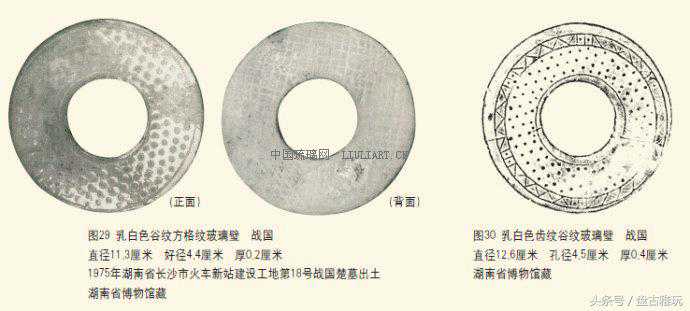 1975年长沙火车新站建设工地15号战国楚墓出土一面近似蒲纹的玻璃璧(图31)。乳白色,璧面用平行线,斜向交织成菱形格子,每格内饰凸起的乳丁纹。蒲纹玉璧凸起六面晶体是琢磨成的,而玻璃璧是模印的,难以形成六面晶体效果,只好用平行线斜向交织,做出象征性的效果。陕西省兴平县出土一面真正蒲纹的玻璃璧,非常精美,也可能是古代湖南生产的(图43)。
