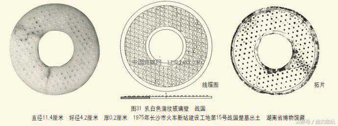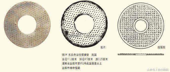 齿纹谷纹复合纹璧这是以齿纹和谷纹为主题纹饰的复合纹玻璃璧。内区饰谷纹,外区饰锯齿纹,肉的内外边缘处,均有一周弦纹。乳白色、半透明,正面光滑,有光泽,另一面粗涩无光。直径12.6厘米、好径4.5厘米、厚0.4厘米(图30)。这件璧的出土情况不清,是上个世纪50年代初,由湖南省文物管理委员会转交湖南省博物馆的。这种璧非常罕见,目前只发现一件。