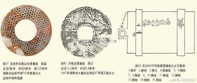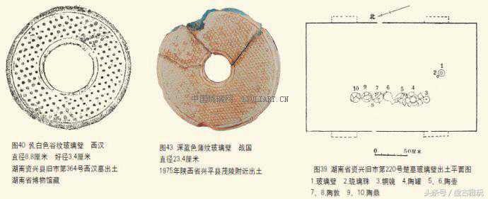 湖南许多县市都出土了玻璃璧,如长沙市出土101件(图7-31),其中楚墓97件,秦汉墓4件。益阳市楚墓36件(图32-37)。资兴市20件,其中楚墓19件(图38、39),汉墓1件(图40)。衡阳市9件。湘乡市7件。汩罗市6件(图5、6)。平江县2件(图41)。郴县、浏阳县、大庸县(图42)、临澧县、株洲市、永州市、辰溪县、龙山县各出1件,共计201件。目前全国共出土战国秦汉玻璃璧233件,湖南出土的玻璃璧占全国总数的百分之八十七。说明中国古代玻璃璧的主要产地在湖南。战国秦汉时期的湖南应有不少的玻璃作坊。尤其是长沙市,出土的玻璃璧几乎占全国出土玻璃璧的半数,这里的玻璃作坊数量多且非常出名。但是,两千年的漫长岁月,沧海桑田,当年红红火火的玻璃作坊已无处寻觅,消失得无影无踪。我们寄希望于今后的考古工作,能有玻璃作坊遗址的发现。