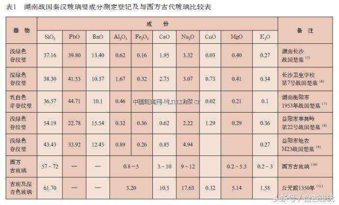 从表1中可以看出,湖南出土的战国秦汉玻璃璧的化学成分,与西方古代玻璃的化学成分,有很明显的不同,那就是中国古代玻璃含有大量的铅和钡,而西方古代玻璃含铅极少,西方含钡较多的玻璃,直到19世纪才出现。美国康宁玻璃公司的古玻璃专家、、在《一批早期中国玻璃的化学分析》一文中指出:“从化学上来分析,对早期中国玻璃最感兴趣的是这些玻璃都含有高的铅和钡。这些玻璃已引起一些学者的注意,这里再报道18个例子。毫无疑问,这些玻璃是在中国制造的,因为19世纪以前在世界其它地方完全不知道这类组成。而西方含大量铅的古玻璃,从没有发现这样高的钡含量。钡可能是作为一种配合料故意引入的。因为它可以像碱一样起助熔作用或对钙的稳定作用。另一方面,它也可能同含铅配料一起带入的。钡在玻璃中还能产生一定混浊度,因此,钡也可能是中国玻璃制造者为获得像玉一样效果的玻璃而引入的。电子探针分析表明这是由于存在二硅酸钡析晶产物,这一结论已由X射线衍射所证实。”美国国家标准局一些研究古玻璃的专家们,通过对中国古代玻璃铅同位素的研究,发现中国古代玻璃中铅同位素比率非常特别。、、在《中国早期玻璃同位素研究》一文中指出:“中国玻璃中的铅与世界其它地方制造的玻璃中的铅完全不同,由于知道这两种特殊同位素比率的矿物产在中国,这就为这些特殊玻璃是中国制造找到了证据。”