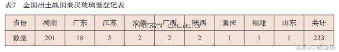 除湖南省外,发现玻璃璧的省份,还有广东,江苏,安徽,广西,陕西,重庆,福建,山东等省市(见表2)。从上表可以看出,玻璃璧的90%左右出于楚地。楚国周边省的玻璃璧,有可能是从楚国流传过去的。看来,玻璃璧是楚国的特产。《战国策·楚策》记载:“楚献鸡骇之犀,夜光之璧于秦王”。这里说的夜光璧,就是玻璃璧。中国古代的玻璃是不透明或半透明的,外观像玉,但比玉有更加明亮的光泽。《汉书·西域传》注:“琉璃色泽光润,踰于众玉。”琉璃是中国古代对玻璃的称呼。《西京杂记》卷二记载:“汉武帝时……白光琉璃为鞍,鞍在暗室中,常照十余丈,如昼日。”所以,古人常常给琉璃冠以“夜光”之名,即当时所谓“夜光之琉璃”,如汉代扬雄《羽猎赋》:“方椎夜光之琉璃。”所谓“夜光之琉璃”,一般是指玻璃。唐人王翰诗:“葡萄美酒夜光杯,欲饮琵琶马上催。醉卧沙场君莫笑,古来征战几人回”。这里所说的夜光杯,也是指一种高级玻璃杯子。《汉书·邹阳传》:“臣闻明月之珠,夜光之璧。”班固《西都赋》说昭阳殿“悬黎垂棘,夜光在焉”。所谓“夜光在焉”,是昭阳殿悬挂了夜光璧——仿玉玻璃璧。