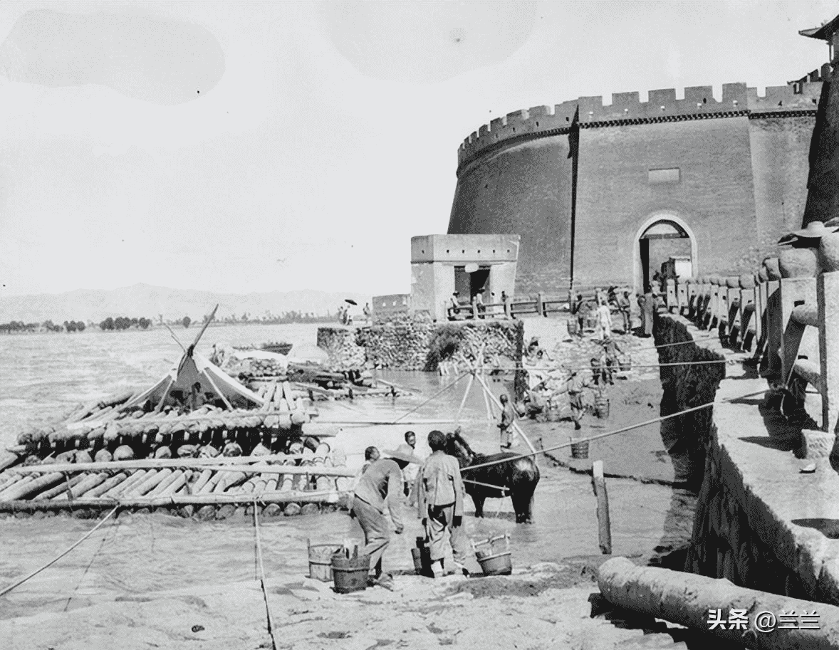 100年前甘肃兰州城墙外的码头,好像还有羊皮筏子。