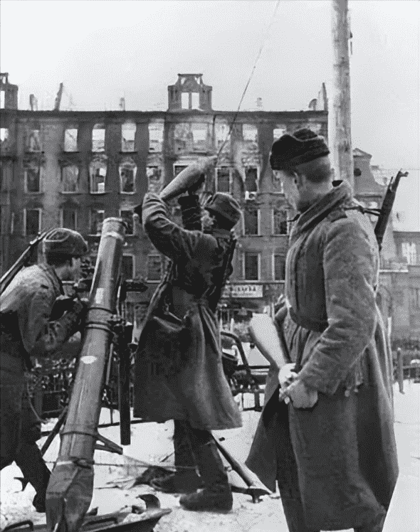 在格莱维茨市附近的街道上,苏军用M1938型120mm重型迫击炮向躲藏在建筑内的纳粹开火