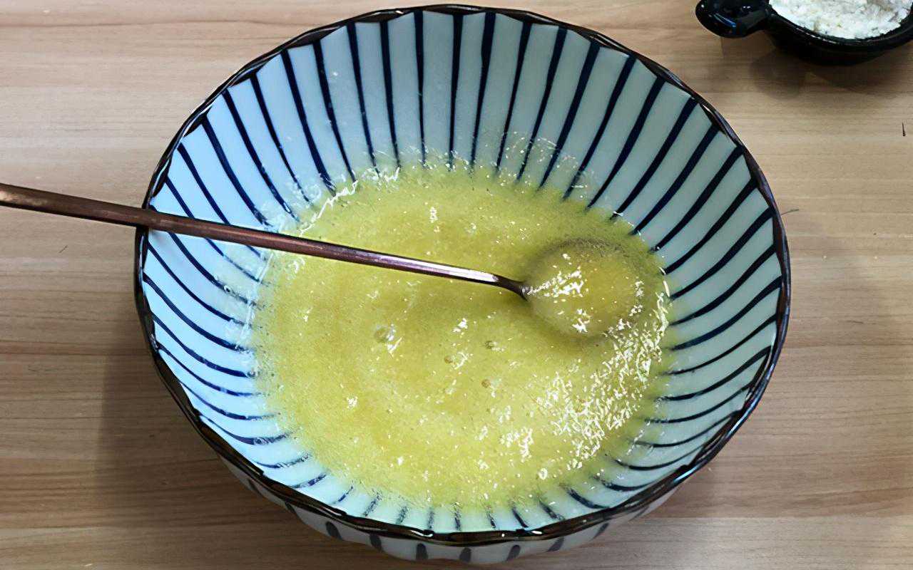 第二步:把蛋清和糖粉倒入碗中充分搅匀,然后把黄油放进微波炉里面叮融化,再快速倒入装有鸡蛋清的碗中,边加边搅拌,搅至黄油和鸡蛋清完全融合。