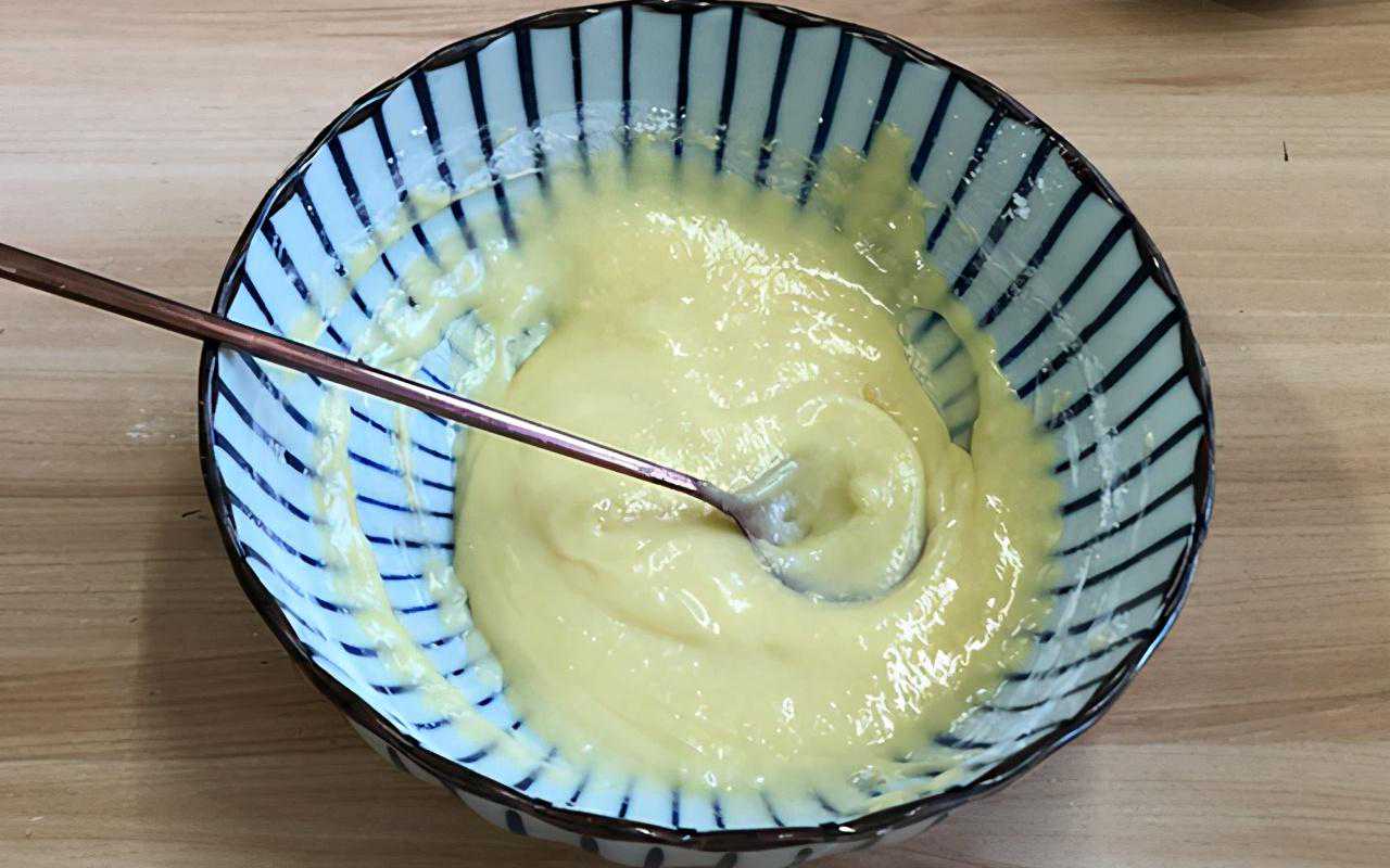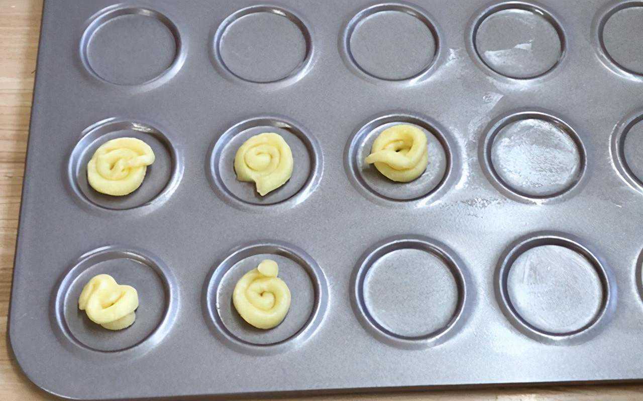 第四步:在裱花袋上剪一个小口,然后把糊糊挤到圆形的小烤盘上(如果没有烤盘就直接挤在吸油纸上),此时的糊糊已经凝固。