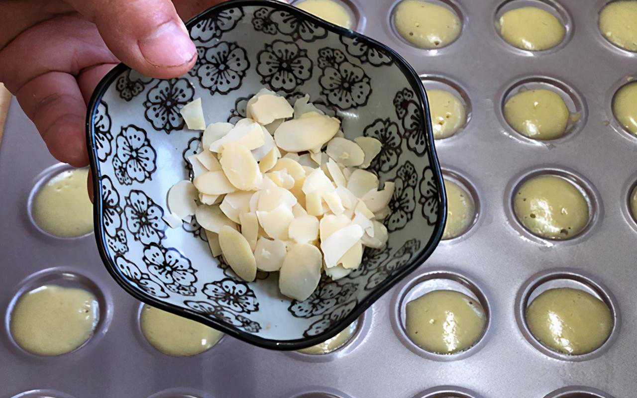 第五步:烤箱上下火175度预热5分钟,把烤盘放进来叮最多10秒钟;然后把温度调低,上下火140度,待烤盘中的糊糊融化,就取出模具,稍稍晃动模子;接着快速把杏仁片摆好。