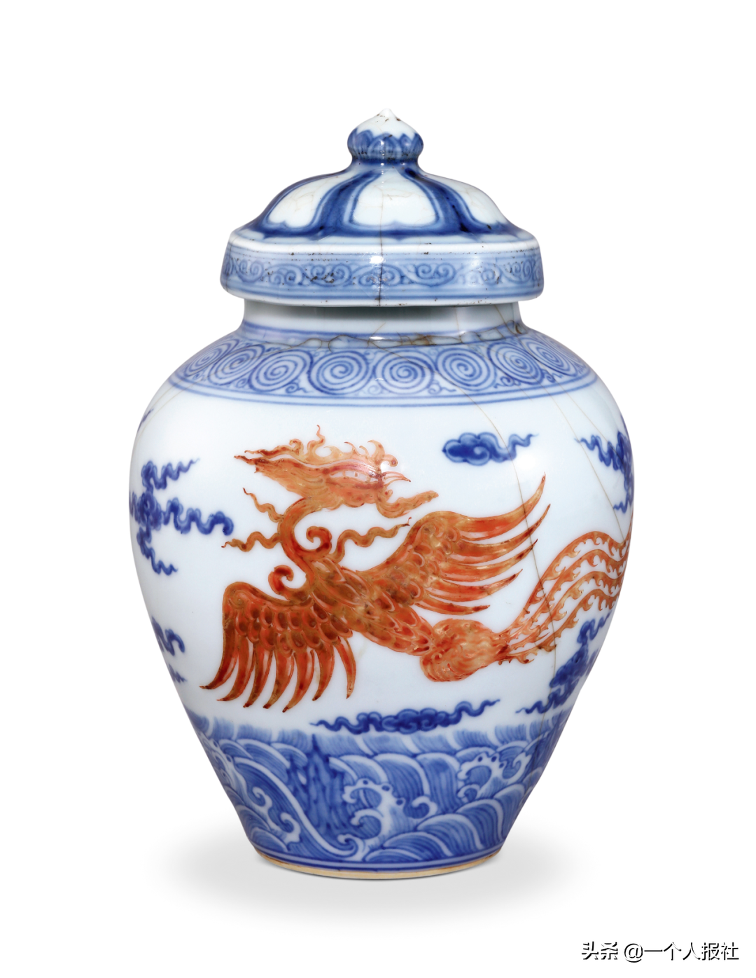 明成化青花海水江崖矾红彩龙凤纹盖罐